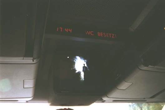 Diese "Videoskulptur" lief im Reisebus, während der Künstler mit einem Laken auf dem Kopf auf der Bustoilette saß.