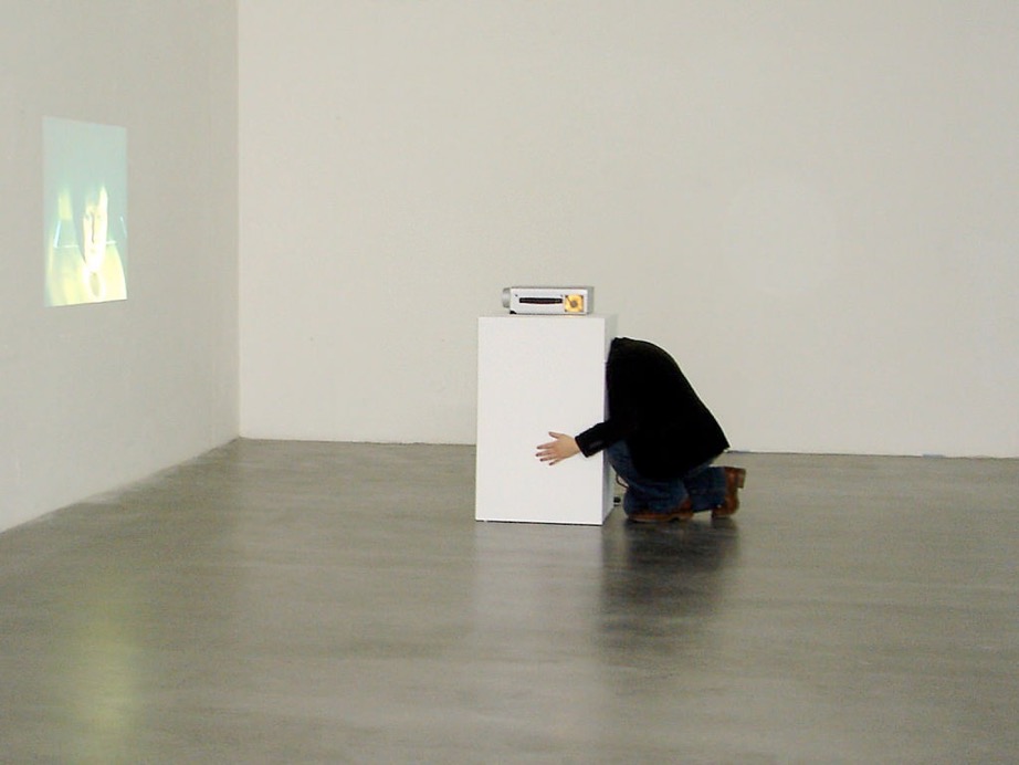Im Innern eines gefertigten Skulpturen-Sockels ist auf dem Boden eine Kamera installiert. Der obere Teil ist so aufklappbar, dass ein Performer seinen Kopf ins Innere des Sockels stecken kann. Der Performer blickt dann in die Kamera. Auf dem Sockel steht ein Videobeamer, der das Livebild an eine Wand oder Leinwand wirft.